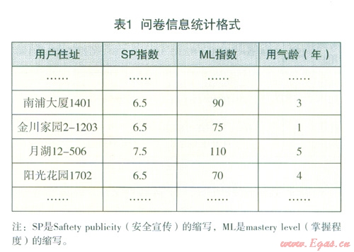 問卷打分采取手工模式,問卷數(shù)據(jù)記錄及統(tǒng)計(jì)采用Microsoft Excel,運(yùn)用軟件中的批量求和程序?qū)?shù)據(jù)進(jìn)行簡單處理,得出每一個(gè)用戶用于表征“燃?xì)獍踩麄鲝?qiáng)度”及“燃?xì)庵R(shí)掌握狀況”的參數(shù)。統(tǒng)汁格式如表1所示: