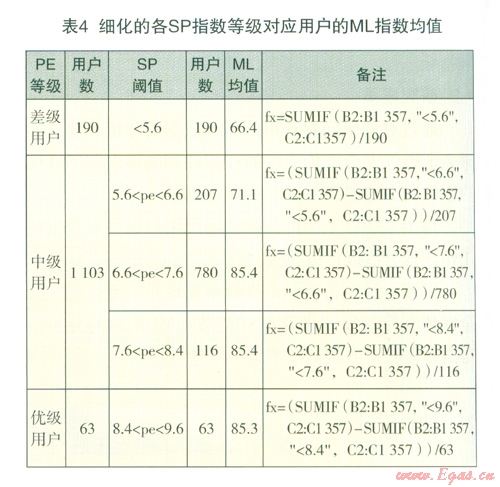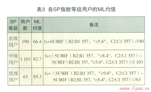 研究方法:對(duì)3種SP指數(shù)等級(jí)的用戶進(jìn)行統(tǒng)計(jì),分別計(jì)算出ML指數(shù)的平均值,再根據(jù)獲得的結(jié)果進(jìn)行分析。統(tǒng)計(jì)采用SUMIF程序。如表3: