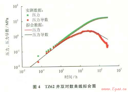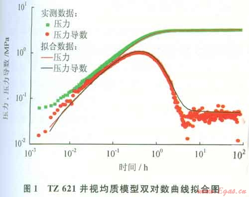 均質(zhì)地層是指均勻分布的滲流介質(zhì),視均質(zhì)地層特征曲線(xiàn)在形態(tài)和表現(xiàn)形式上同均質(zhì)地層一樣,所不同的是流體的儲(chǔ)滲介質(zhì)有所差異,其特征是地層有一定的自然產(chǎn)能,關(guān)井壓力恢復(fù)速度快,雙對(duì)數(shù)診斷圖上導(dǎo)數(shù)曲線(xiàn)具有明顯的徑向流段,能夠反應(yīng)地層內(nèi)部的滲流特征,說(shuō)明儲(chǔ)層自身?xiàng)l件較好,措施效果也是幾種曲線(xiàn)類(lèi)型中最好的,措施成功率最高[2]。