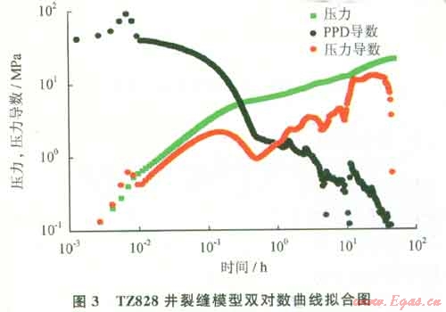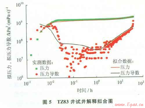 裂縫井模型也是塔中碳酸鹽巖儲(chǔ)層的主要類(lèi)型之一,此類(lèi)井由于基質(zhì)孔滲條件差,能量補(bǔ)給不足,相應(yīng)的產(chǎn)能低、遞減快。如TZ828井,5595~5603m儲(chǔ)層的沉積環(huán)境主要為粒屑灘、礁丘亞相,礁翼、中高能砂屑灘微相。巖性生屑砂屑灰?guī)r、層孔蟲(chóng)骨架巖,含大量棘屑、發(fā)育溶洞、灰色生物礁灰?guī)r、見(jiàn)高角度構(gòu)造縫和蜂窩狀溶蝕孔洞??紫抖绕骄禐?.8%,儲(chǔ)層類(lèi)型以Ⅰ、Ⅱ類(lèi)為主。試油期間開(kāi)井流動(dòng)曲線(xiàn)近似一條直線(xiàn),開(kāi)井期間地面無(wú)產(chǎn)出,表明地層無(wú)自噴能力;關(guān)井壓力曲線(xiàn)恢復(fù)緩慢,反映儲(chǔ)層為低滲透儲(chǔ)層。二次關(guān)井導(dǎo)數(shù)曲線(xiàn)后期出現(xiàn)不規(guī)則,是由于井筒相變的影響造成的,如圖3所示,試井解釋只能用10h以?xún)?nèi)的數(shù)據(jù)。