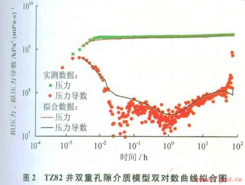 如TZ82井,5430~5487m井段測(cè)井解釋孔隙度為1.35%。沉積亞相為灰泥丘,微相為丘核與丘坪。在5430~5450m井段微相為丘坪,巖性為灰白色含砂屑泥晶灰?guī)r,大量晶洞全充填,少量半充填;5450~5490m井段微相為丘核,巖性為深灰白隱藻泥晶灰?guī)r,下部見(jiàn)大量晶洞被白色方解石充填。主要發(fā)育Ⅳ類(lèi)儲(chǔ)層。試井解釋模型采用雙孔模型(圖2)。