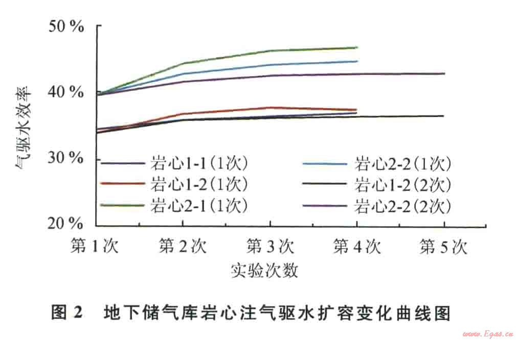 實(shí)驗(yàn)結(jié)果揭示:地下儲(chǔ)氣庫內(nèi)的含水區(qū)可以實(shí)現(xiàn)較高的氣體驅(qū)替,4塊巖心的氣驅(qū)試驗(yàn)壓力降落區(qū)間為地下儲(chǔ)氣庫原始壓力的100%~29%時(shí),第l次氣體驅(qū)替效率可達(dá)到34%~40%,第2、3次累加氣驅(qū)效率可達(dá)36%~46%;地下儲(chǔ)氣庫實(shí)際注采生產(chǎn)過程中隨多周期的注采驅(qū)替,氣驅(qū)水達(dá)容效率是逐步增加的過程,或者說若要實(shí)現(xiàn)地下儲(chǔ)氣庫較高的氣體驅(qū)替效率,則需要多年的注采周期。