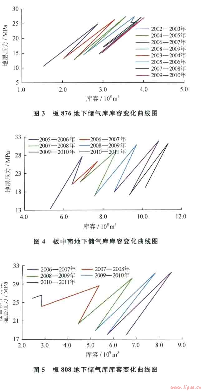 1)地下儲(chǔ)氣庫庫容量呈現(xiàn)逐漸增加的趨勢,并最終趨于最大庫容量。以注氣期結(jié)束時(shí)的庫容量為地下儲(chǔ)氣庫的當(dāng)期庫容量,采氣期結(jié)束時(shí)的庫容量為地下儲(chǔ)氣庫的當(dāng)期墊氣量,庫容量與墊氣量之差即為當(dāng)期工作氣量(采氣量)。從地下儲(chǔ)氣庫的實(shí)際庫容量變化曲線看(圖3~7),隨著地下儲(chǔ)氣庫注采周期的增加,庫容曲線普遍右移,地下儲(chǔ)氣庫庫容明顯增大,而且注采周期越多,庫容增加愈多。板876地下儲(chǔ)氣庫運(yùn)行5~8個(gè)注采周期時(shí),庫容變化曲線基本重疊,表明地下儲(chǔ)氣庫已達(dá)到最大庫容量。由此也說明地下儲(chǔ)氣庫達(dá)容是一個(gè)長期的過程。從已建地下儲(chǔ)氣庫的達(dá)容特征看,水淹型地下儲(chǔ)氣庫的達(dá)容周期超過5年。