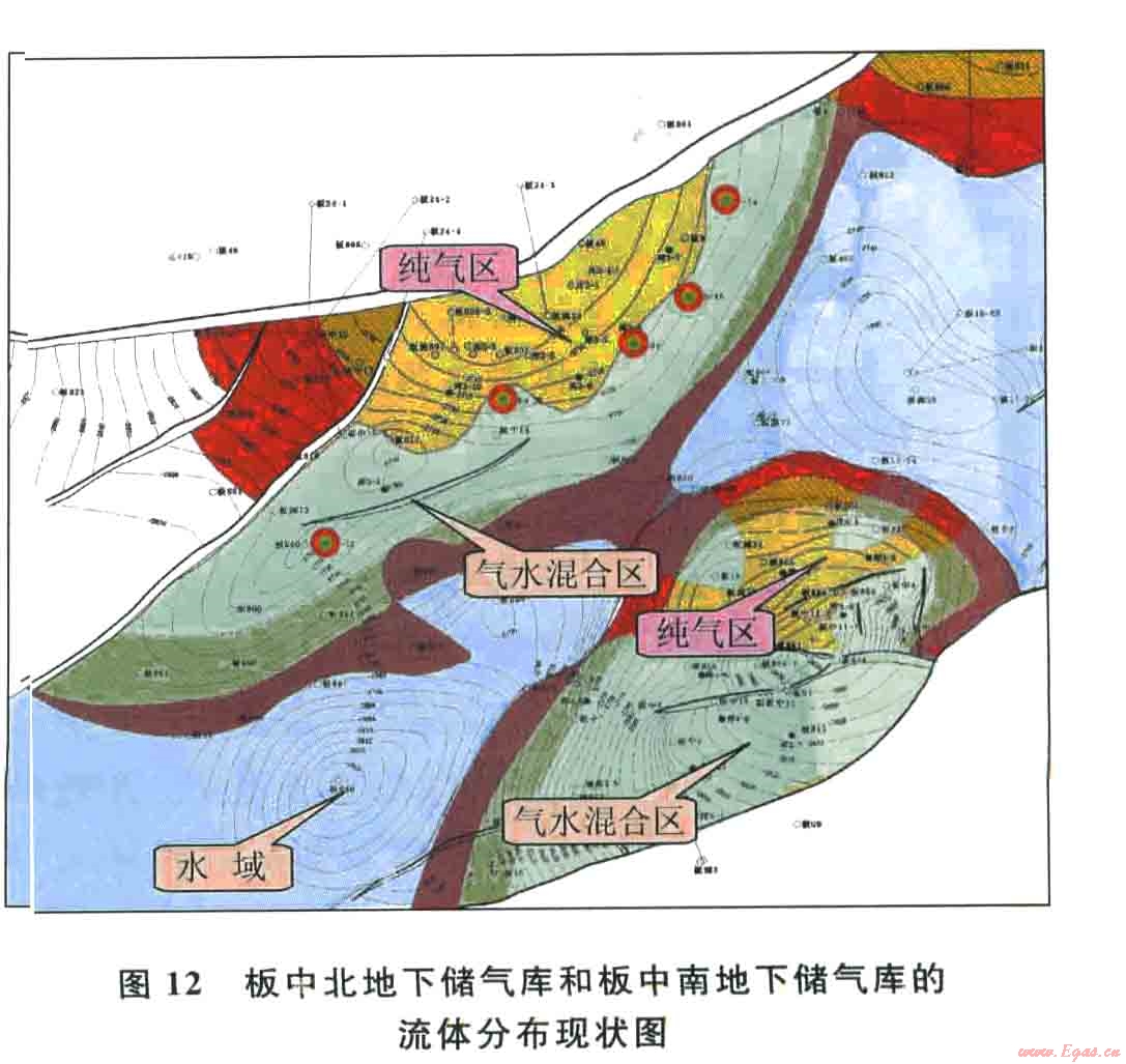 地下儲(chǔ)氣庫的構(gòu)造特征影響著達(dá)容的速度。對于完整的背斜或單斜構(gòu)造型地下儲(chǔ)氣庫,邊部水體在建庫前的氣藏開采階段,由低向高的水侵結(jié)果通常使低部位含水多高部位含水少,流體分布遵循上輕下重的重力分異規(guī)律。當(dāng)?shù)叵聝?chǔ)氣庫采取由高向低的注氣驅(qū)水達(dá)容方案時(shí),這種規(guī)律性表現(xiàn)得更突出,這是由實(shí)踐證實(shí)的普遍性規(guī)律。板中北高點(diǎn)地下儲(chǔ)氣庫7個(gè)注采周期后的流體分布狀態(tài)如圖l2所示。對于內(nèi)部存在較多斷層的破碎型地下儲(chǔ)氣庫,由于斷層的阻隔作用,只能形成局部性的小單元注氣驅(qū)水達(dá)容過程,通常由于范圍小、井?dāng)?shù)少,無法實(shí)現(xiàn)高部位注氣向低部位驅(qū)水的理想過程,造成小單元內(nèi)氣水分布混雜、驅(qū)水達(dá)容效果差,進(jìn)而影響到整個(gè)地下儲(chǔ)氣庫驅(qū)水達(dá)容的效果。如板中南地下儲(chǔ)氣庫整體形態(tài)為一背斜構(gòu)造(見圖12),但由于內(nèi)部發(fā)育有5條小斷層,造成多個(gè)小單元自成系統(tǒng),難以實(shí)現(xiàn)完善的氣體驅(qū)水注采關(guān)系,影響了達(dá)容效率,延長了達(dá)容時(shí)問。板中南地下儲(chǔ)氣庫5個(gè)注采周期后的流體分布狀態(tài)如圖l2所示。