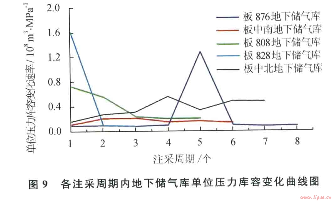 盡管地下儲(chǔ)氣庫的達(dá)容過程具有前快后慢的特點(diǎn),但地下儲(chǔ)氣庫從第2注采周期開始,單位壓力下庫容的變化量即彈性庫容率卻基本維持在一個(gè)穩(wěn)定值,盡管不同地下儲(chǔ)氣庫的該數(shù)值不同,但同一地下儲(chǔ)氣庫彈性庫容率基本穩(wěn)定的規(guī)律相同。地下儲(chǔ)氣庫單位壓力庫容變化曲線圖9所示。同理,在圖3~7中每個(gè)地下儲(chǔ)氣庫不同注采周期的曲線斜率也基本相同,反映每一個(gè)地下儲(chǔ)氣庫在壓力運(yùn)行區(qū)間內(nèi)單位壓力變化所波及的有效孔隙空間容積基本不變。由此推測,實(shí)際上地下儲(chǔ)氣庫內(nèi)的氣水與地下儲(chǔ)氣庫外部的弱水體總體上組成了同一氣水系統(tǒng),類似于定容氣水系統(tǒng)的特征。以板876地下儲(chǔ)氣庫為例,在地下儲(chǔ)氣庫生產(chǎn)運(yùn)行的8個(gè)注采周期中,除第5注采周期生產(chǎn)管理因素外,其余各注采周期的彈性庫容率基本相同,無論庫容增速快慢或庫容量大小變化,但彈性庫容率卻基本不變。但板中北地下儲(chǔ)氣庫卻是個(gè)特例,其具有較強(qiáng)的邊部水體,在地下儲(chǔ)氣庫生產(chǎn)運(yùn)行的7個(gè)注采周期中,隨著注采周期增加庫容量逐漸增大,同期彈性庫容率也逐漸增大,反映了強(qiáng)邊水地下儲(chǔ)氣庫的庫容率變化規(guī)律。