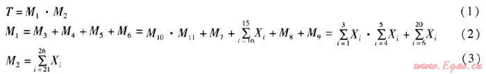 將調(diào)壓站的火災(zāi)爆炸事故作為事故樹頂事件,將天然氣泄漏、存在點(diǎn)火源作為次頂事件。采用此方法逐步深入細(xì)化,直至列出底事件。天然氣調(diào)壓站火災(zāi)爆炸事故樹見圖1,其中T表示頂事件;Mi(i=1~11)表示中間事件;Xi(i=1~26)表示底事件;·表示邏輯與門;+表示邏輯或門。