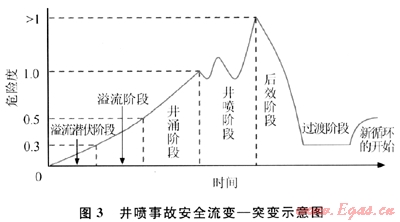 3) 當鉆井溢流沒有得到有效控制而進一步惡化,最終導致地層流體噴出井口,就會很快轉入不安全狀態(tài),即發(fā)生突變。該期間的危險度為由0.5逐漸增加到1,屬于危險狀態(tài)。