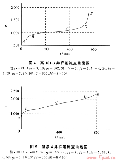 圖4中的AB段是油氣井在外界作用下的減速損傷階段,與承載的時間關系不大,為瞬間損傷。在第一保護區(qū)的作用下,損傷速度由大變小,損傷加速度小于0。BC段是油氣井等速損傷階段,此階段流變曲線形似一條直線,損傷速度接近常數,損傷加速度為0。CD段是油氣井加速損傷階段,此階段損傷速度不斷增大,加速度也大于0。AD段是安全流變階段,其中D點是突變警戒點,從此點開始油氣井的運動開始發(fā)生了質變,進入了危險狀態(tài)。DE屬于安全突變階段。