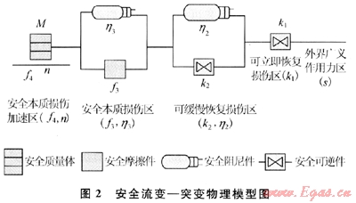 安全流變 突變的物理模型由4組元件組成(如圖2)。整個系統(tǒng)框架模型分為5個層次:外界廣義作用力區(qū)、可立即恢復損傷區(qū)、可緩慢恢復損傷區(qū)、安全本質損傷區(qū)、安全本質損傷加速區(qū),每個層次的反應機理和作用各不相同。事物就是在這種模型下對外界廣義作用力作出相應的反應,最終決定事物是處于安全狀態(tài)還是危險狀態(tài)的。