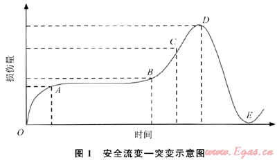 假設將事物的危險狀態(tài)用損傷程度來表示,那么事物的“安全流變-突變”的全過程可以表述為(如圖1):當某一事物誕生后的初期(OA階段),其損傷量在外界力的作用下呈減速遞增,新的狀態(tài)在此期間逐漸形成和完善。當新的狀態(tài)發(fā)展到成熟階段時(AB階段),完善的新狀態(tài)使損傷量勻速緩慢增加。當經過一段穩(wěn)定增加后,原狀態(tài)將再次向無序方向發(fā)展,進而使損傷量值開始加速增大(BC段)。任何事物都有其固有的損傷量承受能力或臨界點(D點),超出此臨界點(D點)后,事物將發(fā)生安全突變。當事物的原狀態(tài)遭到破壞后,事物又重新回到一個新的安全狀態(tài),原事物的狀態(tài)消失,從而又形成了另一個同類新事物誕生的新起點(E點)。物質世界就是在這種安全與危險的無限循環(huán)中得以存在和發(fā)展的[4]。