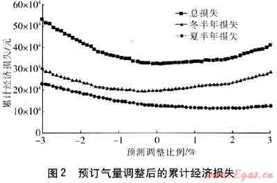 由圖2可知,在負(fù)調(diào)整比例區(qū)間,隨著燃?xì)忸A(yù)測調(diào)整幅度的增加,由于超提日數(shù)和超提氣量增加,超提損失的增長速度明顯大于欠提損失的降低速度,總損失快速增加;在正調(diào)整比例區(qū)間,隨著燃?xì)忸A(yù)測調(diào)整幅度的增加,由于欠提日數(shù)和欠提氣量增加,欠提損失的增長速度大于超提損失的降低速度,總損失逐步增加。冬半年經(jīng)濟(jì)損失與總經(jīng)濟(jì)損失變化趨勢基本相同,夏半年經(jīng)濟(jì)損失在調(diào)整比例為1.5%時(shí)最小。