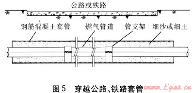 管道往往不可避免地要穿跨越城鎮(zhèn)道路、高速公路、國道(省道)、鐵路(見圖5)及江河或其他特殊設施。對于穿跨越管道,由于管道運行后難以再實施檢修工作或檢修工作難度大、費用高,因此管道穿跨越施工及措施的好壞直接影響著管道穿跨越的質(zhì)量。穿跨越河流段的管道(見圖6),當河床受水流沖刷而使其覆土厚度逐漸減小,將可能造成管道懸空。對于通航河道,如果進行疏?;虼皰佸^時,將對管道構(gòu)成危害。如果管道配重(見圖7)不足,將會造成管道的上浮而破壞。因此,應特別注意穿越深度及穿越層的穩(wěn)定,同時應修建適當?shù)臉酥疚铩⒆o岸、護底、配重塊等保護設施,使管道免于破壞。