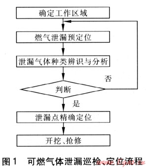 日常的巡檢可采用車載或便攜檢測設備確定工作區(qū)域,如發(fā)現(xiàn)泄漏還需對泄漏氣體進行種類辨識,排除其他氣體(如沼氣)的干擾。對已經(jīng)確定泄漏的管段可先實施對泄漏點的預定位,由在線檢測或日常巡檢確定泄漏的大致區(qū)域,再進行精確定位,如遇硬質路面或在大片區(qū)域內均檢測到高濃度可燃氣體,需結合路面鉆孔機和吸真空系統(tǒng)打孔定位。可燃氣體泄漏巡檢、定位流程見圖1。