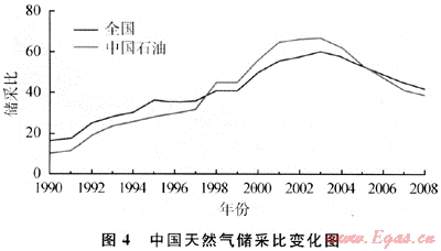 中國的天然氣儲采比在1990年僅為16,后來持續(xù)增長,1998年儲采比首次突破40(為42),2003年達(dá)到最高值(為61,見圖4),隨后因年產(chǎn)量增加而略有下降,2008年為42。中國石油的儲采比從1990年的10增至2003年的67,達(dá)到高峰,隨后下降至2008年的39。2008年中國石化的儲采比為75,中國海油為33。從目前的儲采比來看,中國天然氣產(chǎn)量快速增長具有較好的儲量基礎(chǔ)。