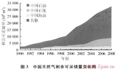 天然氣儲量進(jìn)入新的增長高峰期。自2000年起,中國平均每年新增天然氣可采儲量3018億立方米,其中中國石油年均新增2238億立方米,占全國平均新增可采儲量的74%(圖2)。截至2008年底,中國累計(jì)探明天然氣可采儲量3.9萬億立方米。白1999年起,中國的天然氣剩余可采儲量快速增長,從1萬億立方米增至2008年的3.2萬億立方米,增長了2.2倍。截至2008年底,中國石油的剩余可采儲量占全國的74%(圖3)。天然氣儲量的高速增長支撐了全國天然氣產(chǎn)量的快速提高。
