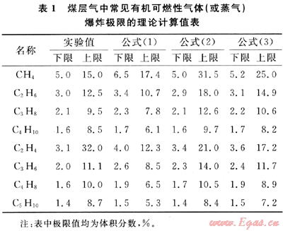 利用上述方法對(duì)煤層氣中常見有機(jī)可燃性氣體(或蒸氣)的爆炸極限進(jìn)行了計(jì)算(見表1)。