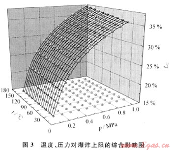 圖3給出了溫度和壓力對(duì)爆炸上限的綜合影響??梢钥闯鲭S著溫度、壓力的提高,爆炸極限范圍增大。在同一溫度下,壓力由0.1MPa升高到1.0MPa,其爆炸極限由15.14%擴(kuò)大到35.74%。在同一壓力下,溫度由25℃升高到160℃,低壓時(shí),爆炸上限幾乎沒有變化;在高壓時(shí),爆炸上限由34.79%上升至35.74%??梢妷毫?duì)爆炸上限的影響甚于溫度對(duì)其的影響。因此,在煤層氣的工業(yè)生產(chǎn)中,應(yīng)盡可能在低壓下操作。