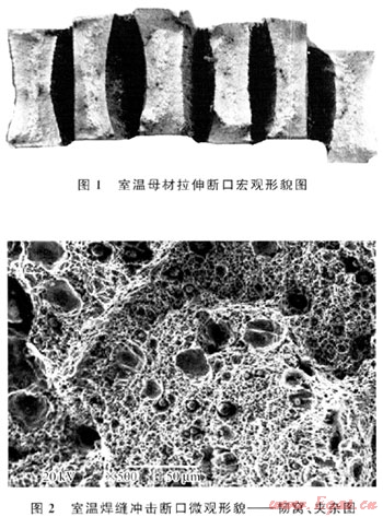 母材拉伸試樣宏觀斷口特征由纖維區(qū)、剪切唇及放射區(qū)3部分組成,屬于韌性斷裂,未發(fā)現(xiàn)明顯的原始缺陷(圖1);焊縫拉伸試樣其中兩件斷在母材,一件斷在焊縫處。從宏觀上看,都是韌性斷口,具有韌窩形貌特征,存在氣孔、未焊透等缺陷;母材室溫沖擊試樣斷口屬韌性斷口,在-10℃下沖擊試樣斷口纖維區(qū)較少,以脆斷為主;焊縫沖擊試樣宏觀上觀察斷口由晶狀區(qū)、纖維區(qū)及剪切唇3部分組成,大部分為晶狀區(qū),纖維區(qū)較少,以脆斷為主,屬于韌-脆性混合型斷口,存在氣孔、未焊透缺陷,如圖2所示;-10℃下沖擊試樣斷口纖維區(qū)較少,具有解理、準(zhǔn)解理形貌以及泥狀花樣特征,以脆斷為主,存在氣孔、未焊透等缺陷(圖3、4)。