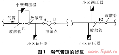 修復(fù)作業(yè)開始時(shí),派人在各調(diào)壓站監(jiān)測各小區(qū)中、低壓管網(wǎng)壓力,當(dāng)確定各小區(qū)均無大量用氣后,關(guān)閉泄漏點(diǎn)兩側(cè)的閥門F1、F2。在閥門F1、F2關(guān)閉后、放散燃?xì)馇?,將各小區(qū)低壓壓力提高到2940Pa后,關(guān)閉小區(qū)調(diào)壓器,以滿足少數(shù)用戶的用氣需求(如果作業(yè)時(shí)小區(qū)的低壓壓力低于784Pa,可打開小區(qū)調(diào)壓器旁通供氣)。在F2閥門左側(cè)的放散管進(jìn)行放散,將中壓壓力降至784~980Pa。壓力降到搶修工作壓力后,開始作業(yè)。秦皇島市燃?xì)夤艿来蟛糠质堑冉孛骅T鐵直管道,接口采用錐套式柔性接口,因此不論泄漏點(diǎn)是位于管道接口還是管道本身,要想修復(fù)均需切掉一段泄漏點(diǎn)所在的管道(長約1m),更換新管道,重新使用連接套連接。切斷管道前,拆掉工作孔A、B上的閥門,塞入阻氣袋(防止切斷管道時(shí)放空燃?xì)猓烊肟諝猱a(chǎn)生爆炸)。然后切斷管道并更換新管道,進(jìn)行接口連接等工作。接口連接完畢,撤出工作孔A處的阻氣袋,通過F1處的小型調(diào)壓器輸送燃?xì)猓萌細(xì)庵脫Q新管道內(nèi)的空氣。置換完成后,撤掉工作孔B處的阻氣袋,稍開閥門F1,使管內(nèi)壓力緩慢上升,達(dá)到運(yùn)行壓力后,對接口進(jìn)行查漏。查漏合格則完全打開閥門F1、F2。在完全開啟閥門F1、F2前,各調(diào)壓站人員關(guān)閉小區(qū)調(diào)壓器旁通閥,準(zhǔn)備恢復(fù)正常供氣。另外,如果小區(qū)壓力低于588Pa,且搶修發(fā)生在夜間,為防止出現(xiàn)用戶室內(nèi)事故,應(yīng)先關(guān)閉調(diào)壓器,在清晨用氣前進(jìn)行恢復(fù)供氣的宣傳,才能開啟調(diào)壓器進(jìn)行供氣;如果小區(qū)壓力大于588Pa,可把壓力直接調(diào)整到正常壓力恢復(fù)供氣。以上工作完成后,回填作業(yè)坑,清理現(xiàn)場,作業(yè)結(jié)束。