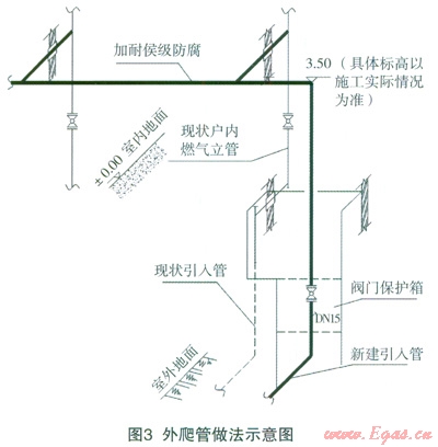 針對(duì)老舊小區(qū),戶內(nèi)立管往往位于居民室內(nèi)裝修或者包封內(nèi),改造難度較大或者不存在改造的可能性,可采用將引入管改至與首層立管相接處的方式,而不改造原有燃?xì)饬⒐?。如果存在地上引入口被占?jí)旱那闆r,而且占?jí)何锊槐阌诓鸪龝r(shí),可采用樓前管采用外爬墻方式敷設(shè),外爬管在樓房燃?xì)饬⒐芩趥?cè)爬至二層樓的0.5m高處,分別與現(xiàn)狀燃?xì)饬⒐芟嘟樱鐖D3所示。