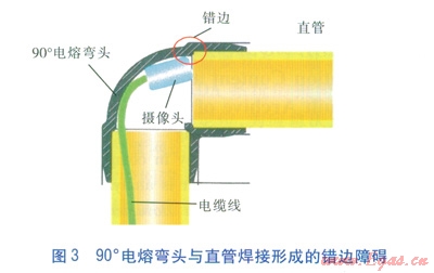 傳統(tǒng)CCTV檢查系統(tǒng)采用的鞍形旁通管件內直徑較小,限制了較大規(guī)格攝像頭的進入。導向管與PE燃氣管道成90°,易導致攝像頭無法按設定方向進入PE燃氣管道。由于攝像頭規(guī)格的限制,所選電纜線的直徑較小,強度不足,無法順利甚至根本無法通過90°電熔彎頭與直管焊接形成的錯邊障礙(見圖3)。