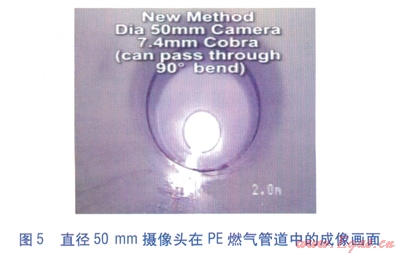 因此,傳統(tǒng)CCTV檢查系統(tǒng)用于PE燃氣管道內檢測時,只能針對含大于90。彎頭的管段或直管段。相對于較大規(guī)格的攝像頭,直徑為24mm的攝像頭亮度及可視范圍也明顯較弱。直徑分別為24、50mm的攝像頭在PE燃氣管道中的成像畫面分別見圖4、5。