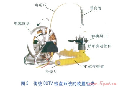 傳統(tǒng)CCTV檢查系統(tǒng)的裝置組成見圖2。經(jīng)導向管、轉換閥門、鞍形旁通管件后攝像頭進入PE燃氣管道內,攝像頭的前進動力來自電纜線。電纜線內置電源線、影像信號線、接地線:電源線為攝像頭(包括照明裝置)供電,信號線把影像傳回顯示器并儲存在儲存器上,接地線為防止攝像頭移動過程中出現(xiàn)放電現(xiàn)象。攝像頭、電纜線均采用防水、防爆設計,既不會因觸水而損毀,也不會引起燃氣爆燃。