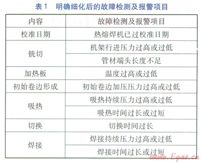GB/T 20674.1—2006對自動熱熔焊機故障檢測項目的要求較為概括,因此我們對自動熱熔焊機的故障檢測及報警項目進行明確細化(見表l)。