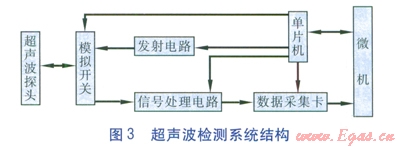 超聲波的檢測系統(tǒng)結構見圖3,超聲波檢測系統(tǒng)主要以單片機為控制核心,數(shù)據(jù)的采集、處理、顯示由微機完成。單片機控制發(fā)射電路發(fā)出窄脈沖,激勵超聲波探頭發(fā)出超聲波,并隨之切換開關,切換到接收回路。然后啟動數(shù)據(jù)采集卡進行數(shù)據(jù)采集,經(jīng)過微機處理后顯示分析結果。超聲波檢測技術測量精度高,能分辨管內壁和外壁腐蝕,不受管材約束,能夠測量漸變腐蝕。但該檢測技術存在檢測盲區(qū),且只能對光潔表面檢測,還需要耦合劑。