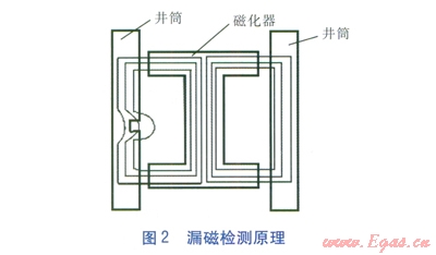 漏磁檢測系統(tǒng)由電源、磁化裝置、檢測探頭、AD模塊、計算機等組成。井筒壁被磁化裝置磁化后發(fā)出電磁信號,該信號被檢測探頭檢出,再由AD模塊采集,最后在計算機中顯示分析結果。該檢測技術對突變缺陷敏感,無檢測盲區(qū),能對管壁進行全面檢測,對表面光潔度要求低,不需要耦合劑。缺點是測量精度低,受管材限制,不能夠測量漸變腐蝕。