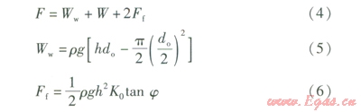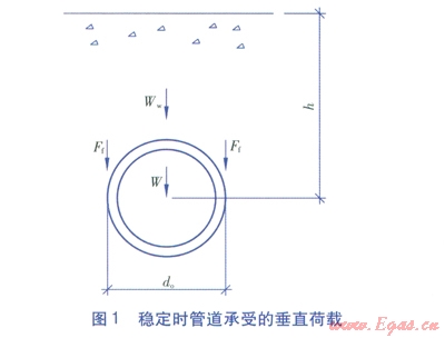 穩(wěn)定時(shí)管道承受的垂直荷載見圖l。由圖1可知,單位管長的垂直載荷F的計(jì)算式為: