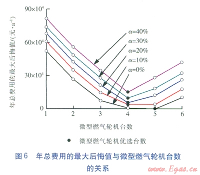 在上述5種工況的優(yōu)化配置方案中,各種設(shè)備的優(yōu)化容量與負(fù)荷不確定度的具體關(guān)系見圖4,其中,溴化鋰機(jī)組和熱泵機(jī)組僅給出了額定制冷量。由圖4可以看出,隨著負(fù)荷不確定度a的增加,地下水地源熱泵機(jī)組的額定制冷量因考慮極限工況而逐漸增大,而微型燃?xì)廨啓C(jī)發(fā)電機(jī)組和煙氣型溴化鋰機(jī)組的容量在考慮負(fù)荷不確定性后反而有所減小。這是因?yàn)轸敯魞?yōu)化配置避免了在負(fù)荷需求偏小時(shí)出現(xiàn)由于所有設(shè)備容量均增大而引起的年總費(fèi)用后悔值增大的情況,從而降低了系統(tǒng)的優(yōu)化配置方案在實(shí)際運(yùn)行時(shí)的經(jīng)濟(jì)風(fēng)險(xiǎn),使其更具經(jīng)濟(jì)魯棒性。