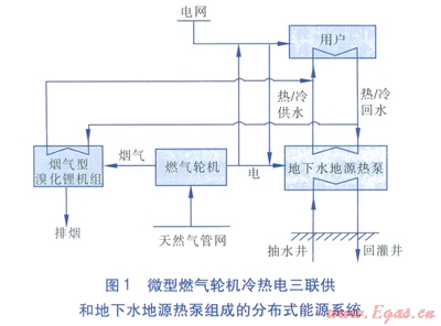 將微型燃?xì)廨啓C(jī)冷熱電三聯(lián)供與性能系數(shù)高、部分負(fù)荷性能好的地下水地源熱泵相結(jié)合,可降低CCHP系統(tǒng)的電熱產(chǎn)出比,緩解其所發(fā)多余電力不能上網(wǎng)的約束,提高系統(tǒng)運(yùn)行靈活性;相對(duì)于單獨(dú)的地下水地源熱泵系統(tǒng),地下抽水量少(受水資源量限制小)。