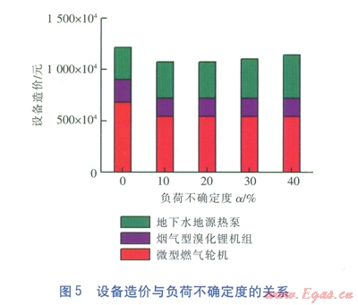 5種工況下相應(yīng)優(yōu)化配置方案的設(shè)備造價(jià)情況見圖5??梢钥闯?,發(fā)電機(jī)組的造價(jià)在系統(tǒng)初投資中占較大比例;由于分布式能源系統(tǒng)的優(yōu)化配置在考慮負(fù)荷不確定性后,發(fā)電機(jī)組的臺(tái)數(shù)由5臺(tái)減為4臺(tái),因此,系統(tǒng)的初投資相對(duì)于傳統(tǒng)的不考慮負(fù)荷不確定性的優(yōu)化配置方案而言有所減少;隨著負(fù)荷不確定度的增加,地下水地源熱泵機(jī)組的造價(jià)因考慮極限工況而增加,使得總的初投資逐漸增加。