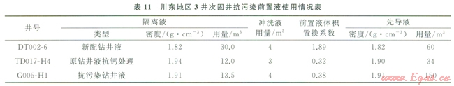 根據(jù)實(shí)踐,川東地區(qū)固井隔離液可以是無污染鉆井液加重后調(diào)整性能,也可以是用生物聚合物或膨潤土粉配置新的加重抗污染鉆井液,還可以是專用的高低密度隔離液體系。同時(shí),現(xiàn)場根據(jù)相容性實(shí)驗(yàn)評價(jià)狀況,沒計(jì)足量的隔離液與沖洗液,提高前置液體積置換系數(shù)[14],減少鉆井液與水泥漿直接接觸的可能性,增大隔離液與井壁接觸時(shí)間,改善頂替效果,保證了固井施工安全(表11)。