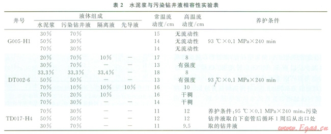 水泥漿水化過程中會產(chǎn)生Ca(OH)2并電離出Ca2+。當(dāng)水泥漿與鉆井液接觸后,Ca2+的存在使黏土顆粒聚結(jié)并形成網(wǎng)狀結(jié)構(gòu),表現(xiàn)為生成黏稠團(tuán)塊的絮凝物質(zhì),使混漿的流動性變差。當(dāng)CO2污染的鉆井液與水泥漿混合后,相容性會變得更差,高溫養(yǎng)護(hù)條件下無流動性、干稠或者漿體形成的強(qiáng)度(表2)。對于污染嚴(yán)重的鉆井液,即使混入一定量的隔離液、先導(dǎo)液等(DT002-6井),也無法滿足設(shè)計(jì)要求。