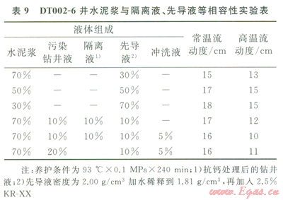 鉆井液受CO2污染影響較嚴(yán)重,但在調(diào)整鉆井液性能后兩者相容性實(shí)驗(yàn)仍無法滿足固井施工要求,同時(shí)井場又不具備替換全部或部分井筒鉆井液條件,可采用抗Ca2+污染處理劑對鉆井液進(jìn)行處理[11],本研究采用了KR-XX類鉆井液抗污染處理劑。由于該類處理劑中部分基團(tuán)對Ca2+有很強(qiáng)螯合能力的特點(diǎn),形成易吸附于水泥顆粒表面的螯合物,降低水泥水化速度,保證水泥漿與鉆井液之間的相容性實(shí)驗(yàn)達(dá)到固井施工要求,DT002-6井在調(diào)整后的鉆井液中加入2.5%的KR-XX處理劑,較好地滿足了相容性實(shí)驗(yàn)要求(表9、10)。