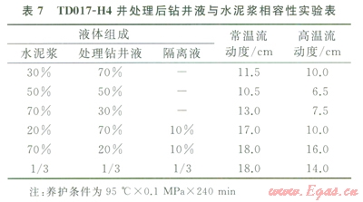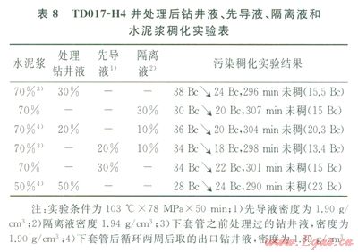 TD017-H4井固井前,對污染的鉆井液加入生石灰進(jìn)行過飽和高鈣處理,同時(shí)配制先導(dǎo)液和隔離液,較好滿足鉆井液與水泥漿之間的相容性實(shí)驗(yàn)要求(表7、8)。