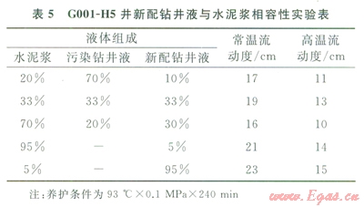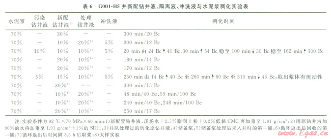 在CO2對鉆井液污染嚴(yán)重的情況下,為保證固井施工安全,有條件的情況下可以對鉆井液進(jìn)行全井或部分置換,防止鉆井液與水泥漿間接觸而提前稠化,影響固井施工安全。G00l-H5井固井前,井漿黏度和切力較高、循環(huán)壓耗大,在多次處理鉆井液不能滿足固井施工要求情況下,利用儲備鉆井液處理后對原井漿進(jìn)行全井替換,并配置抗鈣新鉆井液作為隔離液,滿足了兩相或多相相容性實(shí)驗(yàn)要求(表5、6)。