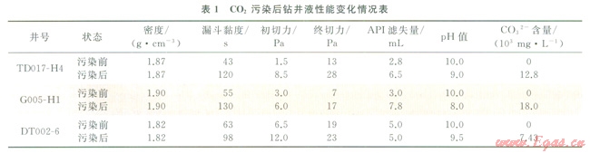 資料表明,CO2侵入鉆井液后,當(dāng)HCO3-和CO32-含量小于2000mg/L時(shí),對鉆井液性能不會產(chǎn)生大的影響,鉆井液仍能維持較低的黏度和切力;當(dāng)HCO3-和CO32-含量大于2400mg/L時(shí),鉆井液黏度和切力增加;當(dāng)HCO3-和CO32-含量大于2500mg/L,pH值不大于9時(shí),鉆井液黏度和切力劇增、濾失量增大,此時(shí)難以有效調(diào)整鉆井液性能。同時(shí)隨著井溫的升高,HCO3-和CO32-對鉆井液性能的影響程度加劇[8]。表l為川東地區(qū)3口井的鉆井液受CO2污染前后的性能變化,數(shù)據(jù)顯示鉆井液受CO2污染后黏度和切力上升、失水增大、pH值降低,且性能變化程度隨CO2含量增加而加大。