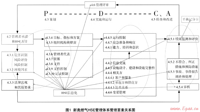 新奧燃氣參考了國際、國內(nèi)范圍內(nèi)有關(guān)的HSE標準,建立并發(fā)布了新奧燃氣HSE管理體系企業(yè)標準(Q/XARQ01.1-2007),覆蓋SY/T6276—1997《石油天然氣工業(yè)健康、安全與環(huán)境管理體系規(guī)范》所有要求。并要求旗下所有企業(yè)按標準要求建立并實施HSE管理體系并形成三級文件管理體系。新奧燃氣HSE管理體系企業(yè)標準各要素之間的關(guān)系如圖1所示。
