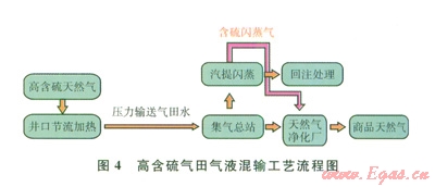 自主研發(fā)了以控制流態(tài)為核心的氣液混輸技術,在國內首次界定了輸送介質的最大、最小流速,減緩了管內液體沉積對管道的腐蝕,確保了緩蝕劑的應用效果。首次在國內高含硫氣田應用氣液密閉混輸技術,高含硫氣田水經閃蒸脫氣后集中處理回注,含硫閃蒸氣集中進入后續(xù)硫磺回收裝置,實現(xiàn)了氣田水和硫化氫全程零排放,每年回注氣田水400×104 m3。提出了高含硫氣田安全截斷、緊急放空和安全儀表系統(tǒng)控制設置原則,防止了意外工況下有毒氣體外泄。圖4為高含硫氣田氣液混輸工藝流程圖。
