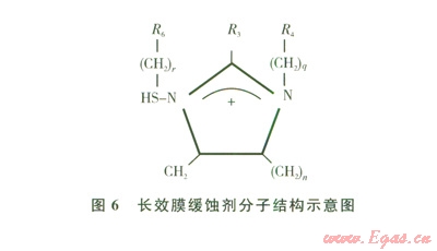 通過改進緩蝕劑分子結構,引入巰基基團,增強了緩蝕劑的吸附成膜性能,與國外同類產品相比緩蝕劑的膜持久時間由10 d提高到45 d。應用了清管器預膜技術,解決了長距離管線緩蝕劑均勻保護和殘余藥劑回收的技術難題。首次在四川龍崗高含硫氣田進行了全流程管線整體應用清管器預膜技術。圖6為長效膜緩蝕劑分子結構示意圖。