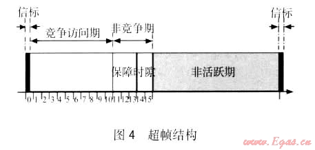 在IEEE802.15.4 MAC協(xié)議定義了超幀結(jié)構(gòu),如圖4所示。在幀群中存在兩個部分:活躍期與不活躍期(休眠期),在活躍期開放信道接入,休眠期關(guān)閉信道,進(jìn)入休眠狀態(tài)以減少能耗。