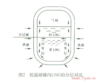渦旋主要是由于在向盛有LNG的低溫儲罐中充注新的LNG液體或者LNG中氮蒸發(fā)而使儲罐內(nèi)的液體發(fā)生分層。分層液體在儲罐周邊漏熱的作用下,形成各自獨立的自然對流循環(huán),進(jìn)而使各層液體的密度不斷發(fā)生變化,見圖2。當(dāng)相鄰兩層液體的密度近似相等時,兩個液層就會發(fā)生強烈混合,下層積聚的熱量突然釋放出來,同時伴隨著LNG表面蒸發(fā)率的驟增,幾乎可達(dá)到正常情況下蒸發(fā)率的250倍。蒸發(fā)產(chǎn)生的大量氣體,引起儲罐內(nèi)壓力突然增大,導(dǎo)致大量天然氣排空,造成嚴(yán)重浪費,甚至可能毀壞儲罐及工藝系統(tǒng),引起爆炸或火災(zāi),嚴(yán)重威脅人員和財產(chǎn)安全。