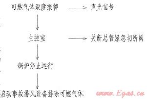 防爆場所的通風(fēng)一般有兩種方式:自然通風(fēng)、機械通風(fēng)。自然通風(fēng)由建筑專業(yè)設(shè)計考慮。機械通風(fēng)由暖通專業(yè)設(shè)計考慮。在燃氣鍋爐房內(nèi)設(shè)計可燃氣體濃度報警裝置和火災(zāi)報警裝置??扇細怏w濃度報警裝置按照可燃氣體爆炸下限20%設(shè)置報警點,其控制過程如下: