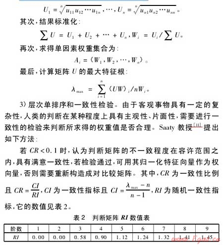 2)構(gòu)造判斷矩陣并求最大特征根。根據(jù)已建立的因素層次分析結(jié)構(gòu)圖對各影響因素進行兩兩對比分析,構(gòu)造判斷矩陣進行計算,求解判斷矩陣的最大特征根λmax及與其對應(yīng)的正規(guī)化特征向量,具體計算步驟為:首先,計算各行中元素乘積的n次方根: