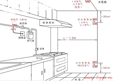 該探測(cè)器可以安裝在氣瓶輸出的瓶組間,也可以安裝在使用氣體的廚房間,如果是液化石油氣,氣體探測(cè)器安裝在離地面30公分處。(因?yàn)橐夯蜌獗瓤諝庵?,發(fā)生泄漏以后氣體下沉)使用天然氣就要安裝在天花板或則用氣設(shè)施的上方。探測(cè)器可以調(diào)整和設(shè)定燃?xì)鉂舛葓?bào)警數(shù)值。一般可以設(shè)定在15%,一旦氣體濃度達(dá)到15%。探測(cè)器,自動(dòng)輸出一個(gè)開(kāi)關(guān)信號(hào)??梢钥刂茩C(jī)械手動(dòng)作關(guān)閉多個(gè)進(jìn)氣閥門(mén)。同時(shí)可以控制開(kāi)啟防爆排風(fēng)扇工作。通過(guò)安裝的無(wú)線發(fā)射器,控制放置在收銀臺(tái)(可以保證長(zhǎng)期有人在場(chǎng))和廚房間的語(yǔ)音報(bào)警器發(fā)出:“氣體發(fā)生泄漏,已經(jīng)切斷了氣源。請(qǐng)立即派人處理。