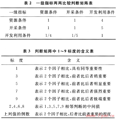 煤層氣勘查潛力指標(biāo)體系分為4層,其中目標(biāo)層為綜合評價值,準(zhǔn)則層有3層(分為三級指標(biāo))。下面以一級指標(biāo)權(quán)重計算為例,描述層次分析法確定權(quán)重的過程。專家討論后的打分結(jié)果見表2。專家打分時一般采用數(shù)字1~9及其倒數(shù)作為重要性標(biāo)度,其含義見表3,計算方法參見本文參考文獻(xiàn)[15]。