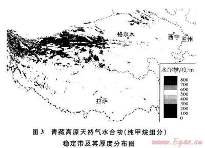 進(jìn)一步地,筆者分別利用祁連山木里地區(qū)33號鉆孔冷泉氣(CH4:96.6%,C2H6:3.3%,C3H8:0.1%,均為摩爾分?jǐn)?shù),下同)、風(fēng)火山-鳥麗地區(qū)頂空氣平均值(CH4:93.8%,C2H6:6.2%)和羌塘盆地雙湖地區(qū)頂空氣平均值(CH4:63.3%,C2H6:24.3%,C3H8:8.9%,nC4H103.5%)等實測氣體組分,結(jié)合青藏高原的其他參數(shù),對青藏高原天然氣水合物的穩(wěn)定帶及其厚度進(jìn)行了計算,結(jié)果顯示青藏高原具備較好的天然氣水合物形成條件,即使要求最為苛刻的純甲烷水合物也能在局部地區(qū)形成(圖3),且隨著重?zé)N組分的逐漸增加,能形成水合物的地區(qū)范圍逐漸增大,水合物穩(wěn)定帶厚度也逐漸增厚。